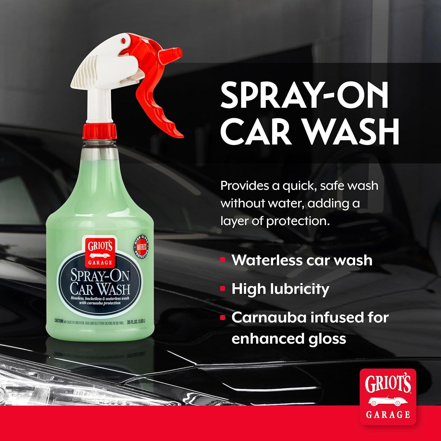 Forget the hose and bucket—Griot's Garage Spray-On Car Wash makes cleaning your vehicle easier than ever. This high-lubricity formula is a waterless car wash and wax solution that safely removes dirt, dust, and road grime without scratching your paint. Whether you're limited by water restrictions, cold weather, or just want a faster clean, this dry car wash delivers a streak-free shine. The spray clings to your vehicle’s surface, loosening grime on contact. Just mist it on, let it dwell for a few seconds, and wipe clean with a soft microfiber towel, no rinsing required. It even includes carnauba wax for added gloss and protection, making it ideal for washless car wash routines or in-between deep cleans. Safe for use on all finishes, including paint protection films and wraps, this spray is a must-have for any car detailing kit.